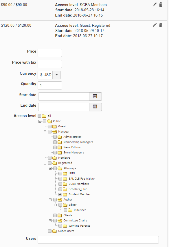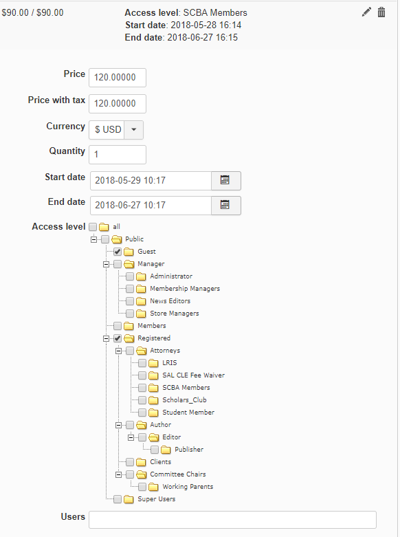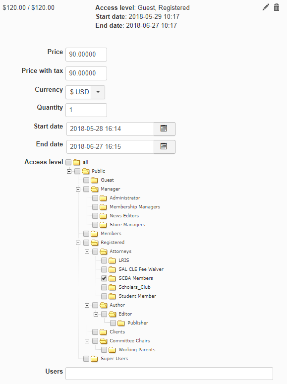 $120 (access groups Guest and Registered are checked off (but none of the subgroups under registered):