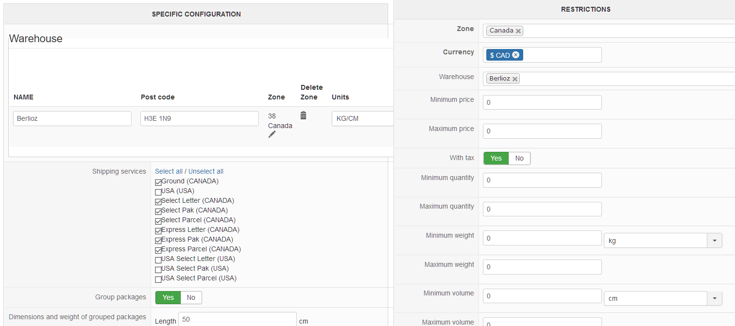 Note that you should actually make sure that you have at least 1 row configured through the "warehouse" tab of the "Specific configuration" area.