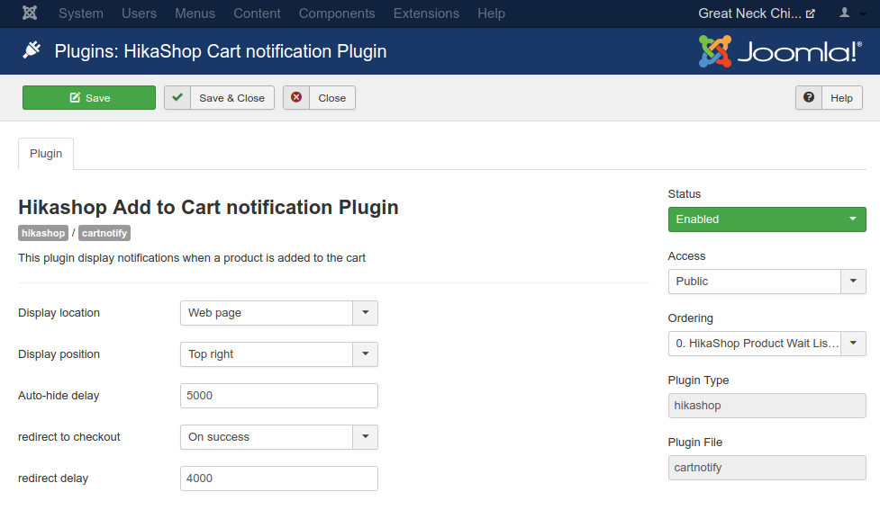 The attached screenshot is the HikaShop cart notification plugin, the redirect to checkout setting is "On Success"
