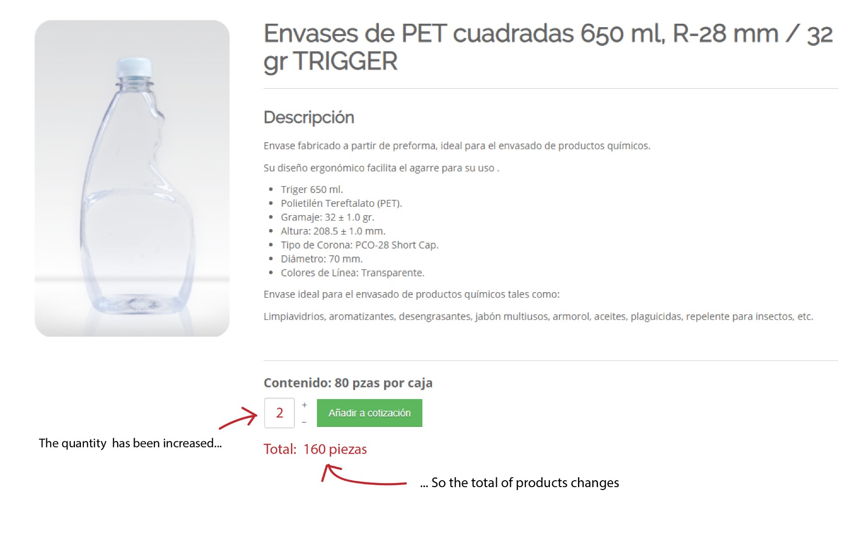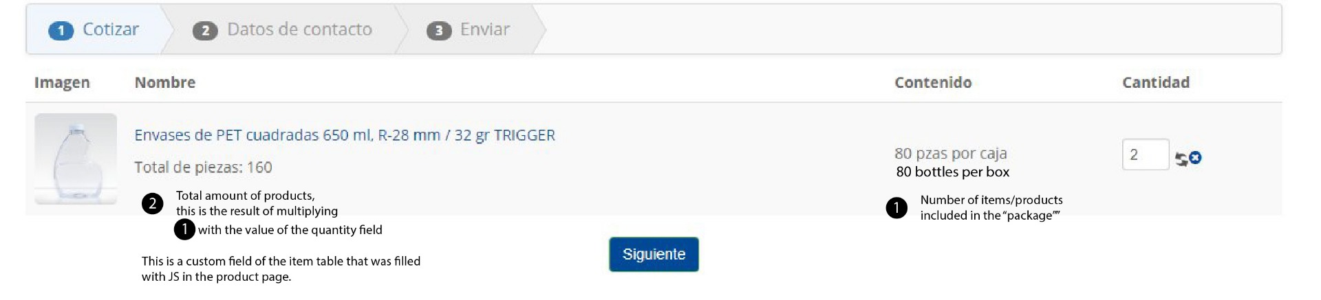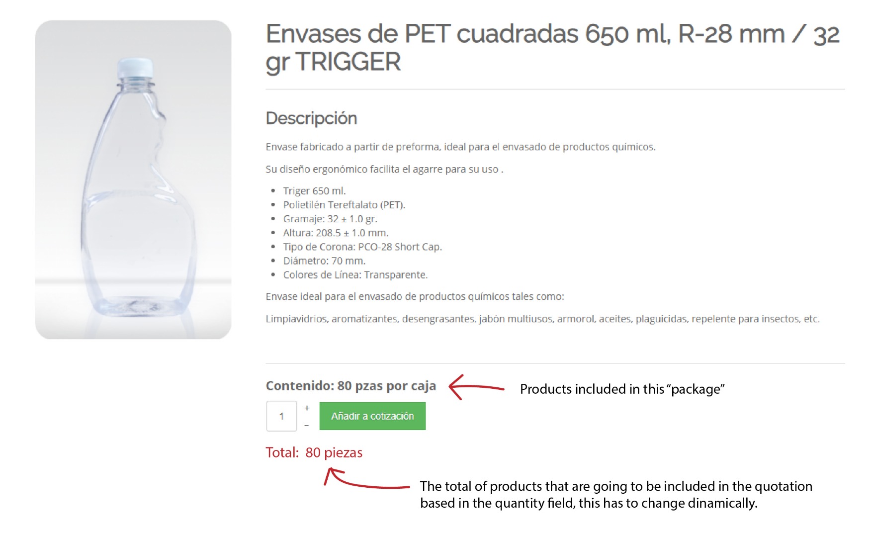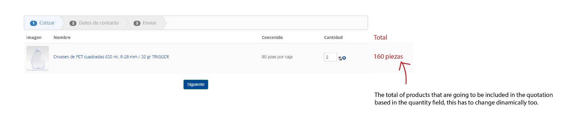 I have added the necessary JS and HTML to show and update the total amount of products. Also with JS, I set the value of a new custom field of the item table called "total" so I can have a way to save it into the database. This field is hidden with CSS in the product page.