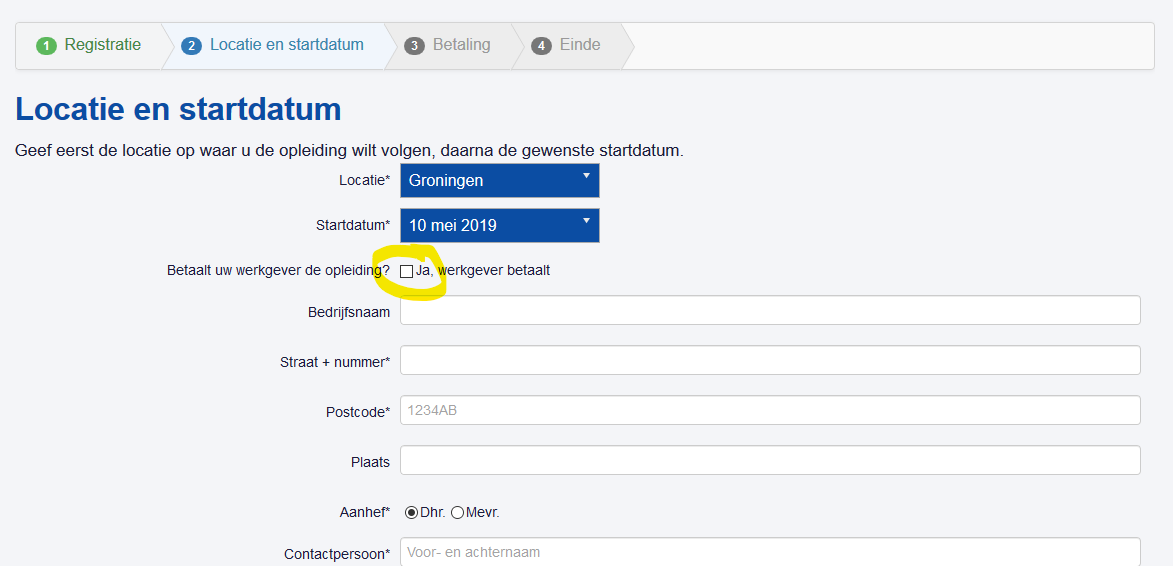 After login click "volgende", then you find the page like the screenshot with the "ja, werkgever betaald" checkbox custom field.