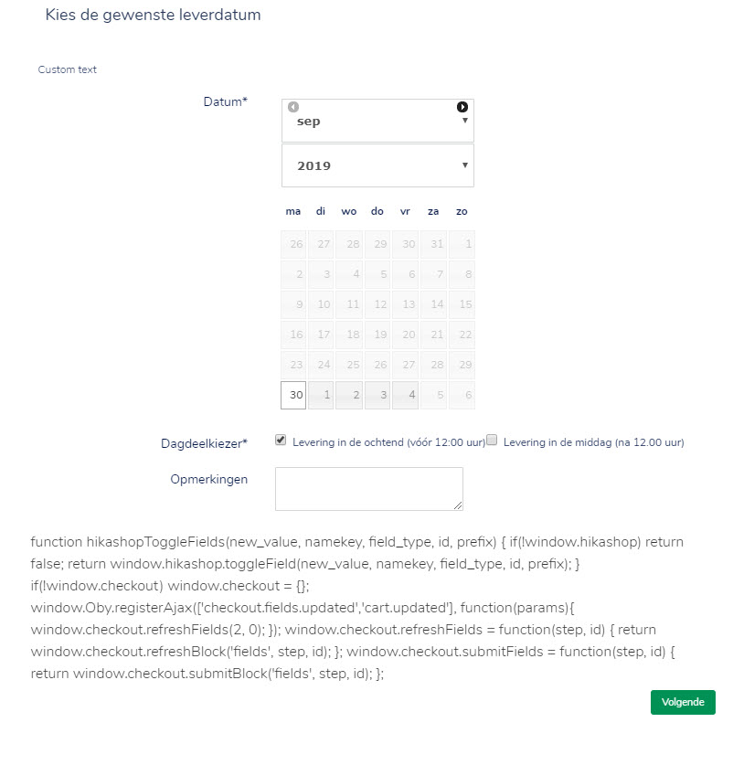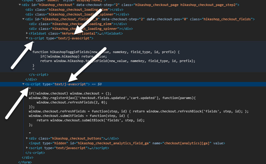 When we apply an override (from the Hikashop backend) to the show_block_fields view (checkout) the inline javascript on the page in the browser gets 'distored'. This is really weird...