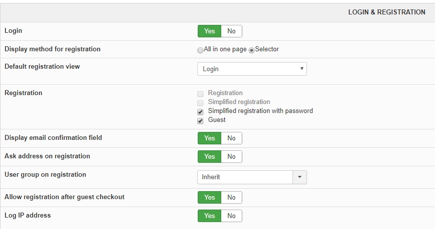 I've set the Login and Registration on the checkout to Simplified registration with password. And the Display method for registration to Selector.
