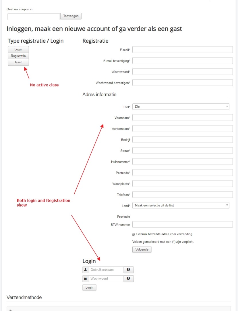 On load the checkout both login and Registration form show. Also none of the selector buttons is selected because the active button misses the active class. I switched to the Protostar template to make sure there are no overrides active. I've added some screenshots to clarify.