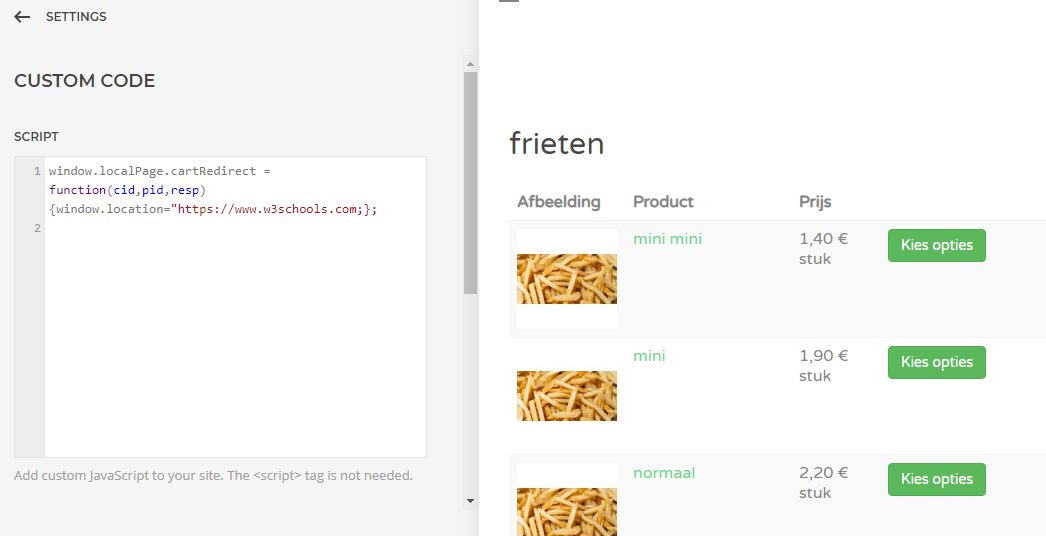 <script>try { window.localPage.cartRedirect = function(cid,pid,resp){window.location="https://www.w3schools.com";};