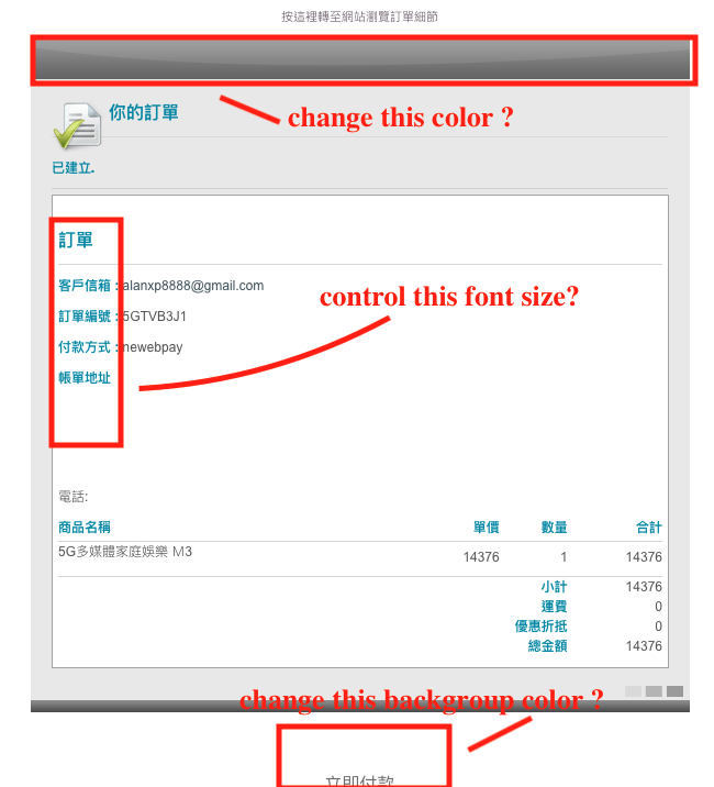 And for the color of the header image, you'll have to do your own image, upload it on your website, and change media/com_hikashop/images/mail/header.png to use that new header image instead of the default one.