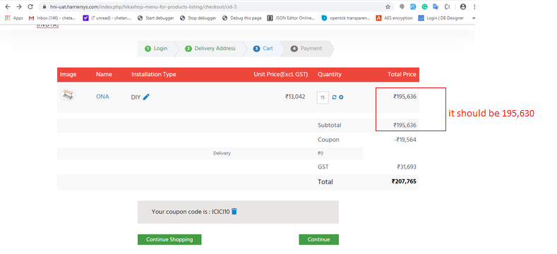In my checkout process, When I have added more than one quantity of the same product then it is showing incorrect total price and subtotal.