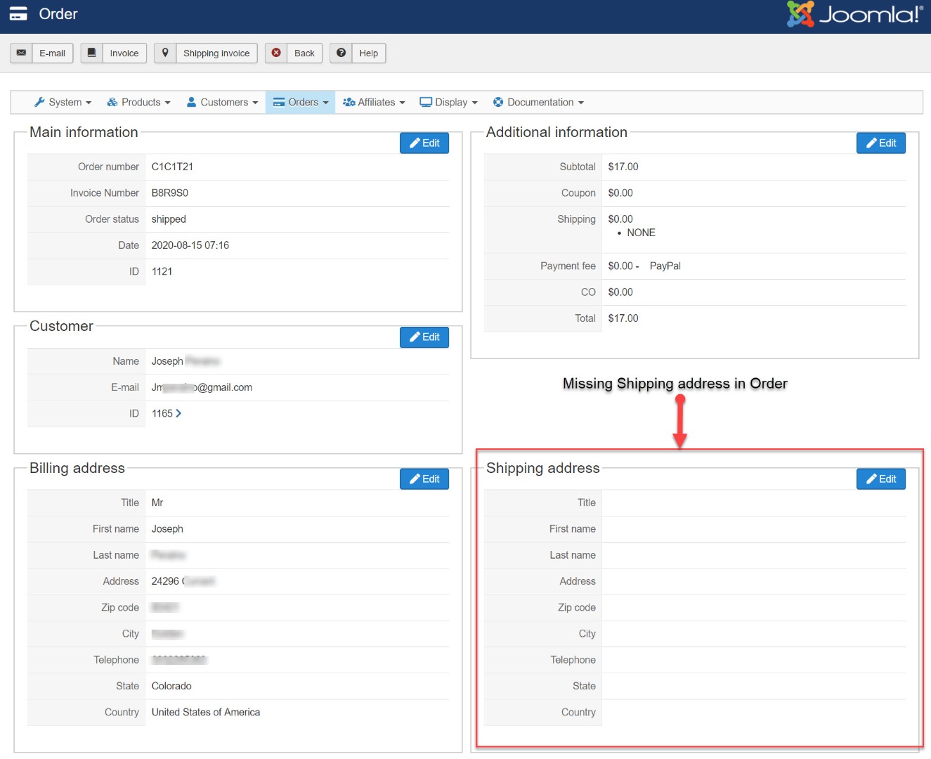 In the order we have a Missing "Shipping address" as can be seen in the order screenshot: