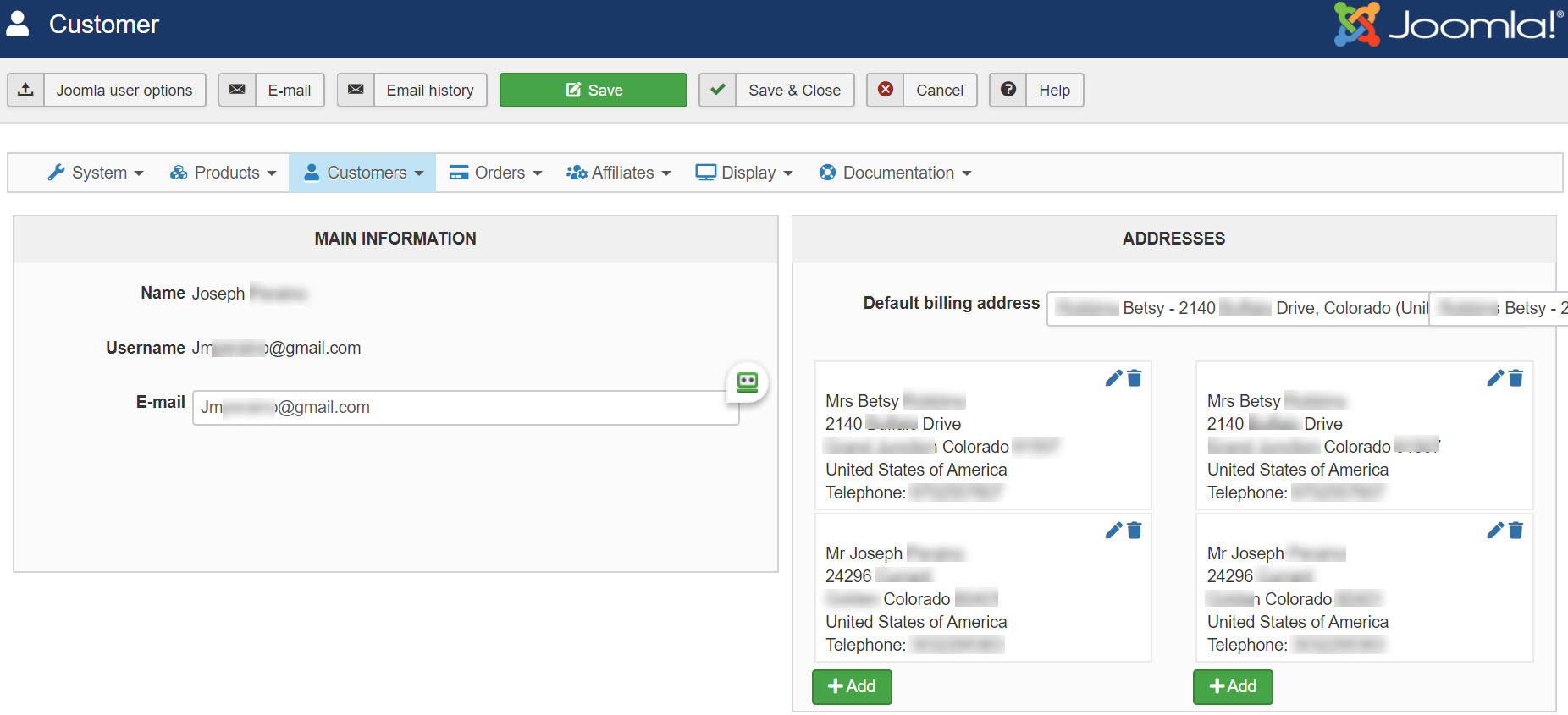 Here is a screenshot of the User Profile. Note that it has two billing and shipping addresses one for a "Joseph" and one for a "Betsy" each with different addresses. There is no missing "Shipping Address" in the profile