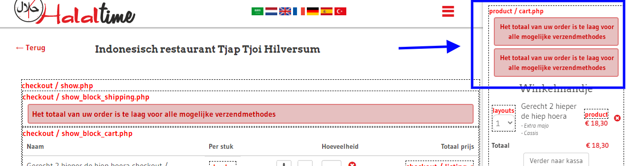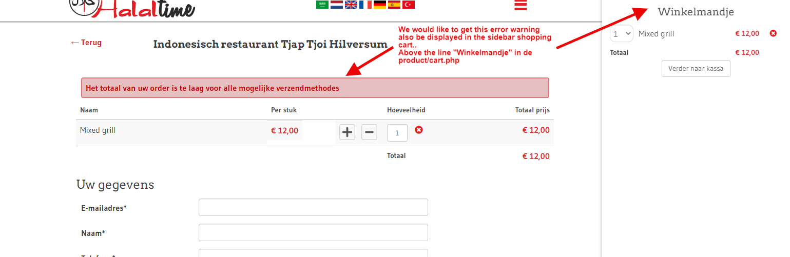 We get a warning when a certain amount is not yet in the shopping cart, we would like this to be displayed also in the cart in de sidebar.