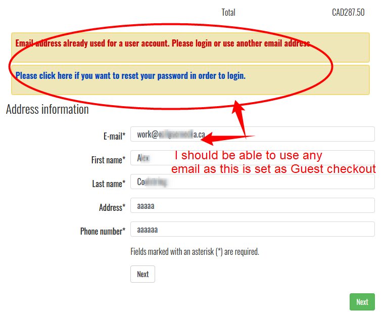 The way the checkout works, we can't allow someone to use an email address of an existing user account. Otherwise, it would create a security issue as anyone with the email address of a user account on your website would be able to access the addresses of that user and other sensetive data that only the user himself should access.
