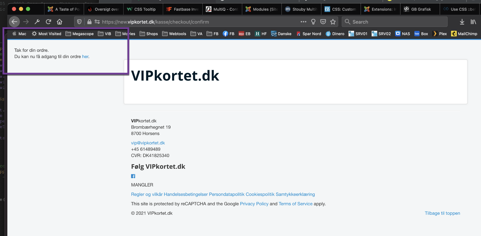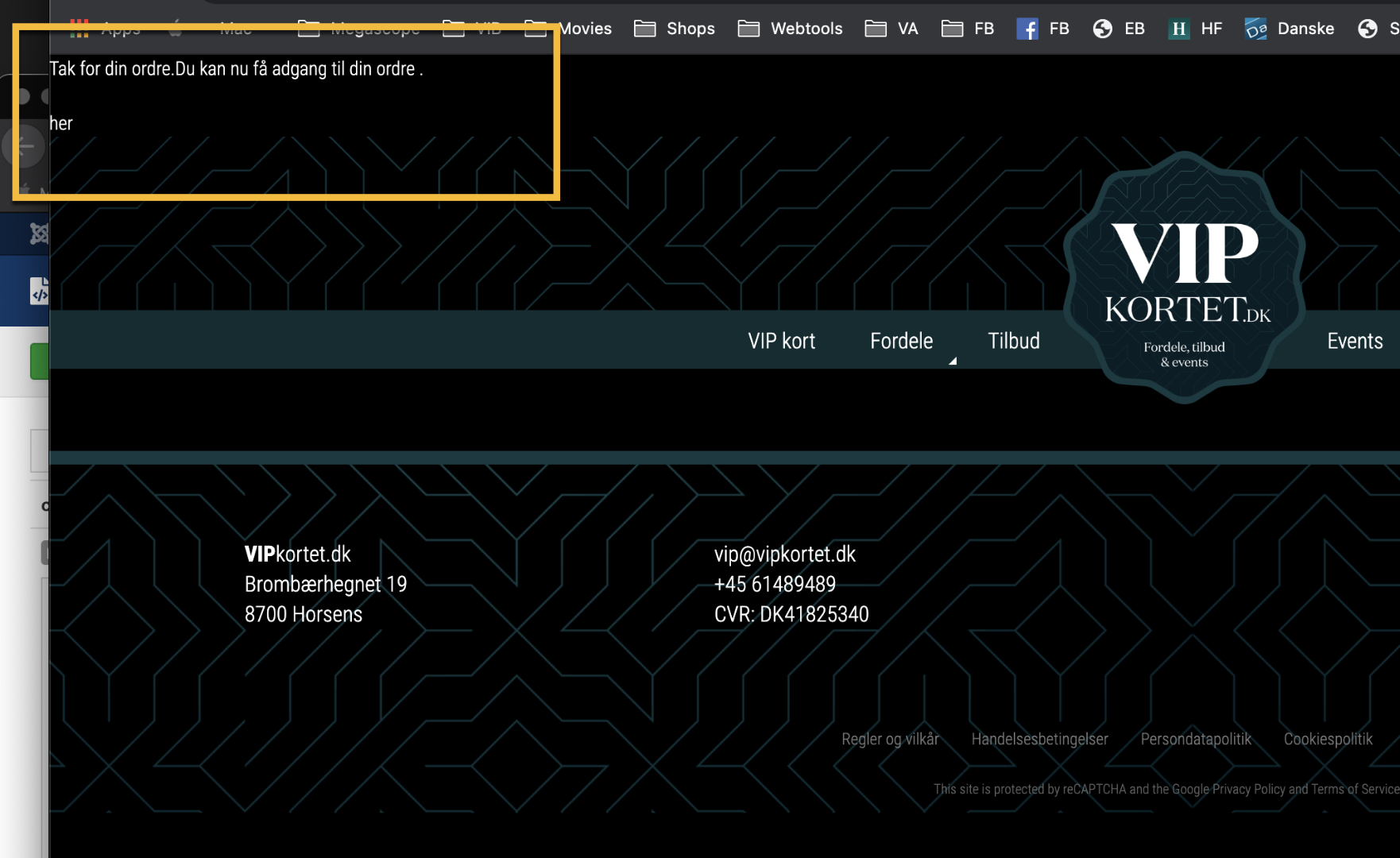 You can see that the text "Tak for din ordre.Du kan nu få adgang til din ordre ." is at the beginning of the body tag, next you have HikaShop's hidden footer tag (with the version number), and then you have HTML comments and scripts from the template. Then, you have some DIVs of the template, and then you have the "her" link to access the order and finally you have CSS and JS files which are supposed to be in the head of the page, not the body.