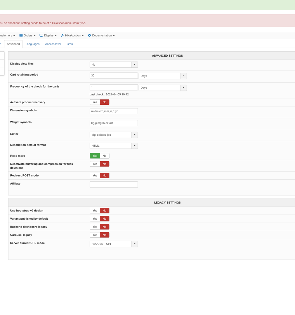 <<It's normal that you have these legacy settings. And yes you can turn them off to use the new elements of HikaShop.