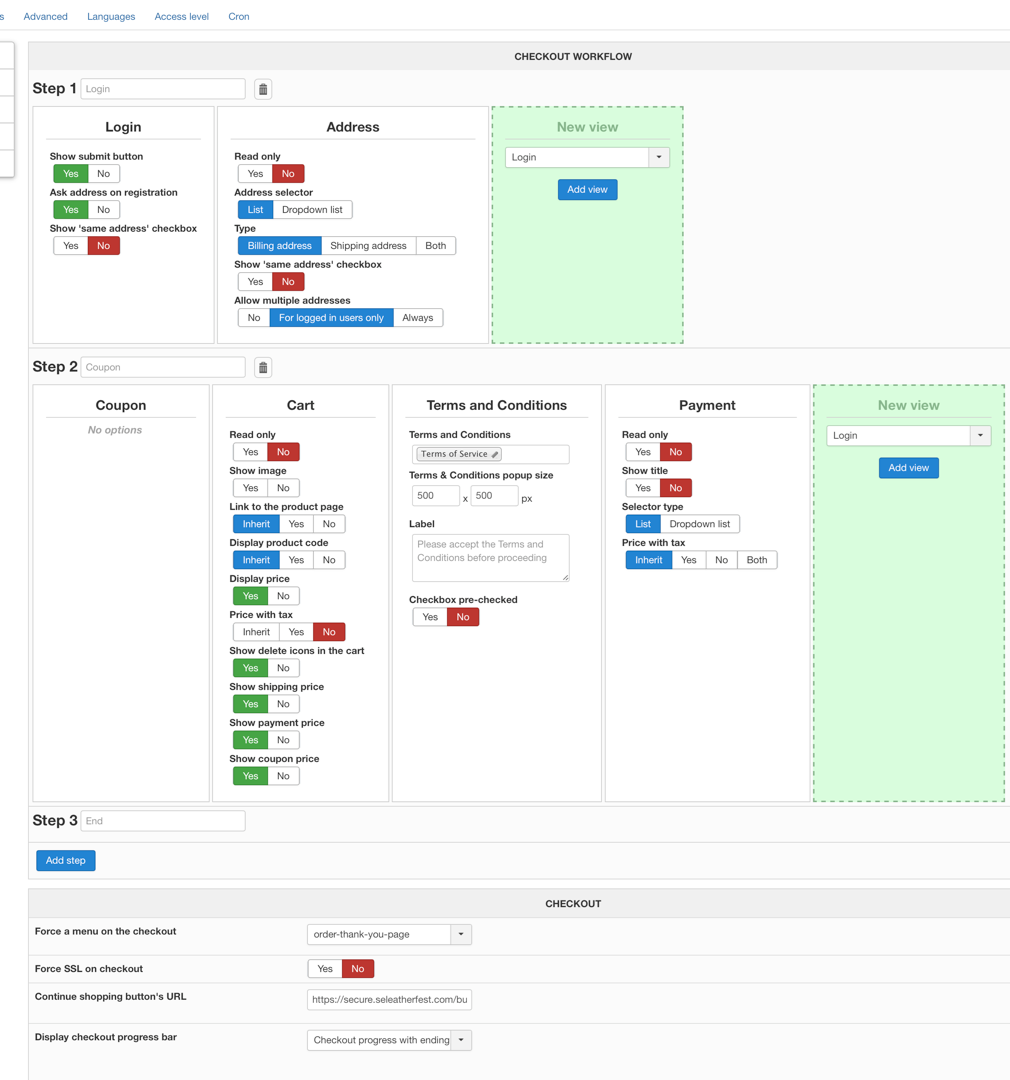 <<2. I think it's linked to the error message you get on the configuration page in the backend. As the menu selected for the checkout is invalid, the system is not able to access the other steps of the checkout due to the SEF system not redirecting properly.