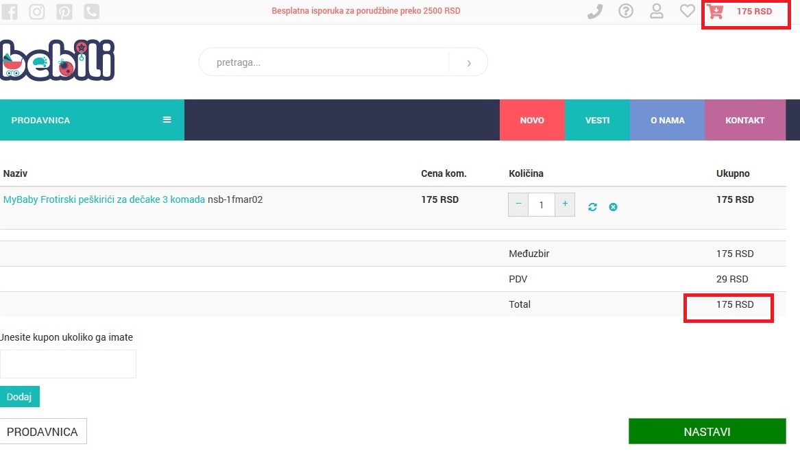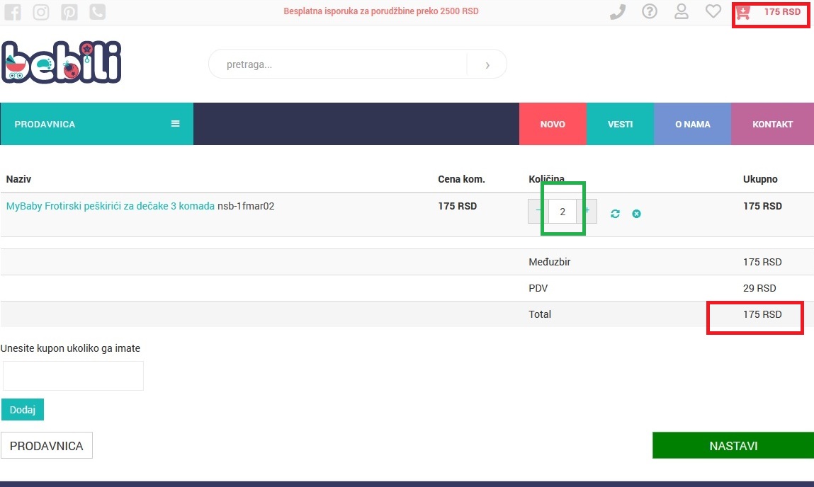 2. You can see picture called "Before" how it looks like. Amount in cart is 175RSD