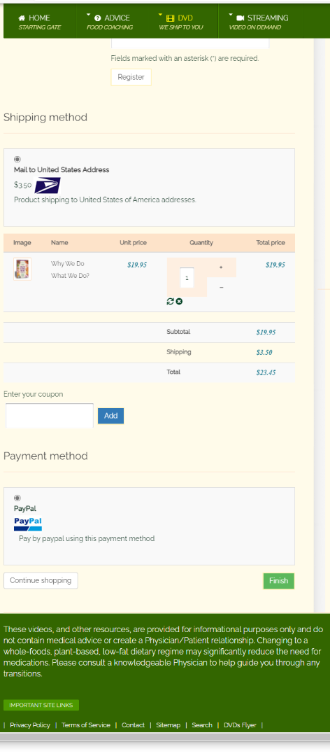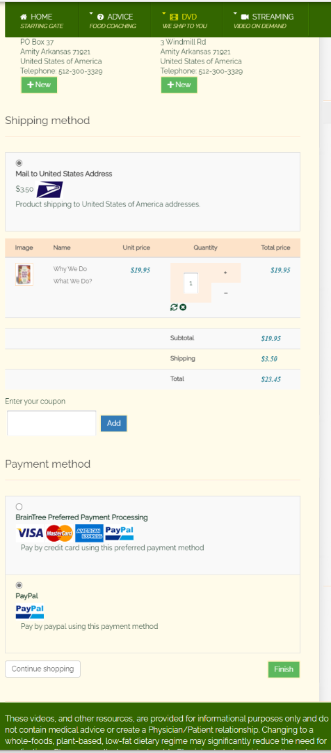 I have discovered a really strange problem where one of my purchasing options (Braintree) is not displaying in the checkout screen when purchasing a single DVD that was placed into the cart. This may be related to my previous ticket because the only option that shows is my PayPal option. But, selecting that PayPal option and clicking on the Finish button causes nothing to happen except for the little whirling icon being visible. I have another ticket open about that issue.