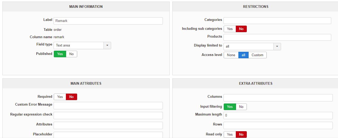 Custom fields remarks retained at checkout flow