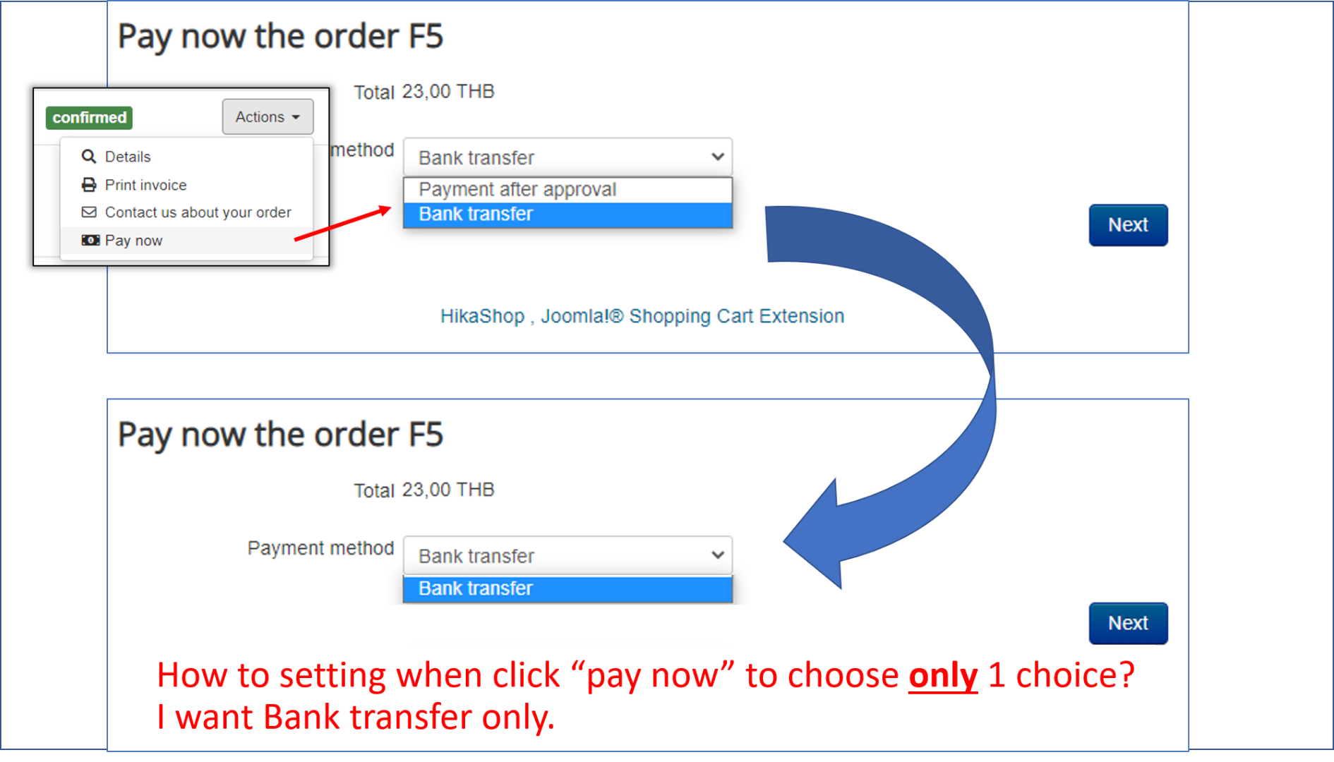 Finally, before changing the order status from "created to "approved" for an order, you'll also want to change the payment method of the order from your "payment after approval" payment method to your normal payment method so that the user will be able to pay with it. And if you have several payment methods, you can activate the "Allow customers to change their payment method after checkout" setting of the HikaShop configuration to allow the customer to choose his payment method before paying