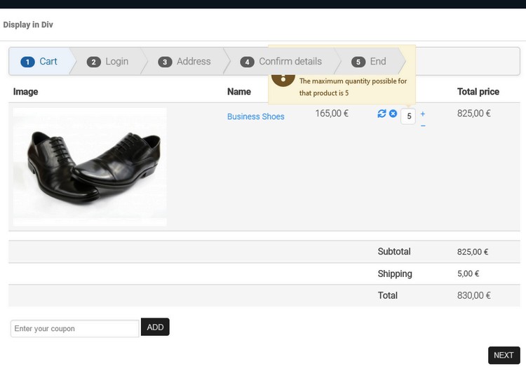 In step 1 (Cart) it's possibe to increase the ordered quantity of a product. If the actual stock is exceeded, a popup shows up for a few seconds. The message notifies about the maximum quantity possible.