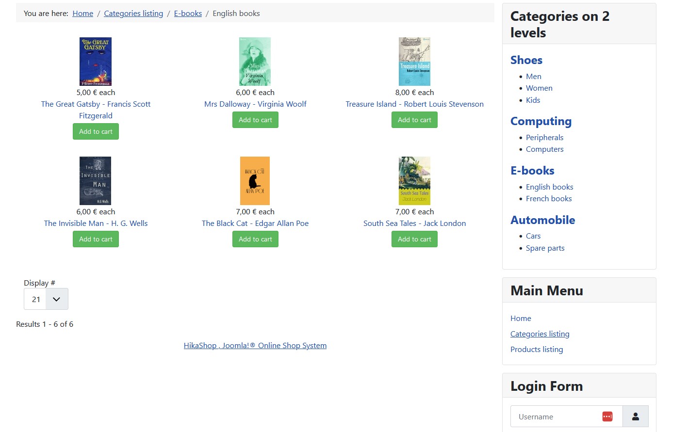 With the installation of HikaShop, I chose the default settings for the menu- and layout structure and also installed the Sample data.