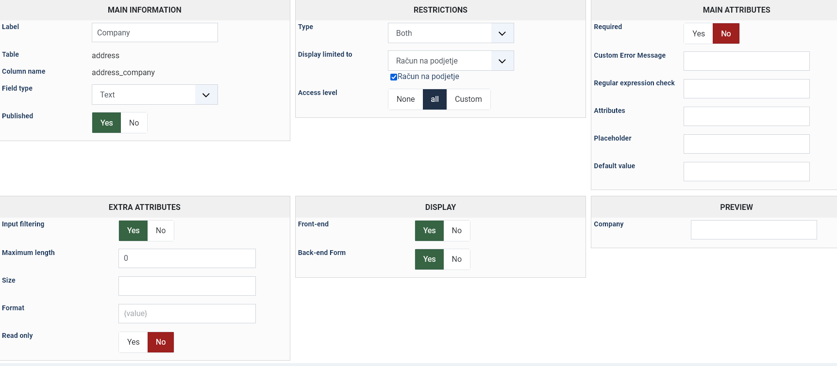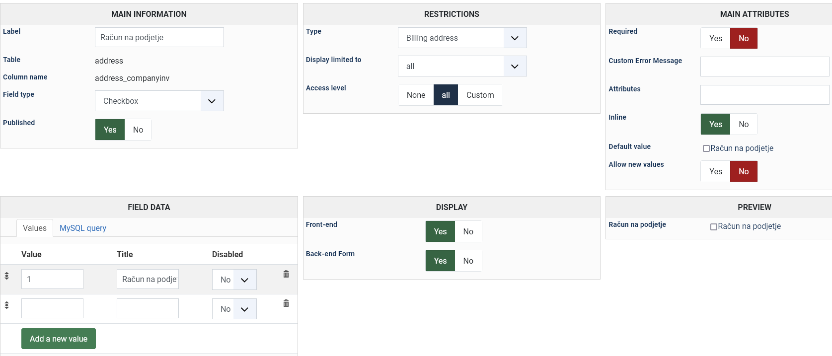 I added custom field checkbox in table address to show/hide company and vat fields. So if customer cheks "Račun na podjetje", company fields are displayed. This works, but if I uncheck, field is not hiding.