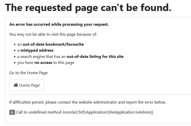 -- Error-message(debug-mod must be tuned on) -- : Call to undefined method Joomla\CMS\Application\SiteApplication::isAdmin()