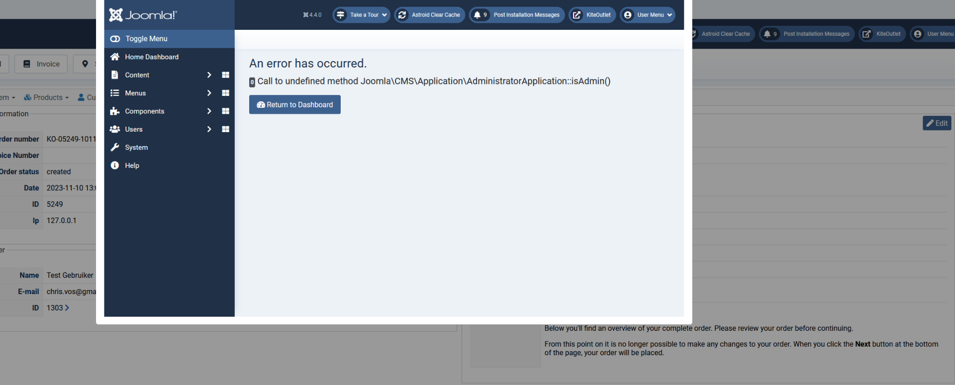 I am in the process of (finally) updating a clients website to Joomla 4. I have made a local (Xampp) clone of the live website and thought I had everything working smoothly. However when I try to place an order though the shop, after hitting the 'finish' button to finalize the order, I get a blank screen with the error message: 0 Call to undefined method Joomla\CMS\Application\SiteApplication::isAdmin() (See attached screenshot)