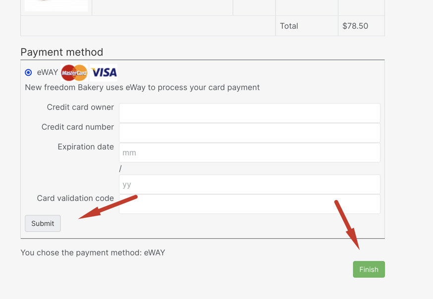 The "submit" button is to validate the credit card information while the "finish" button will attempt to create the order and process the payment. They are not the same buttons.