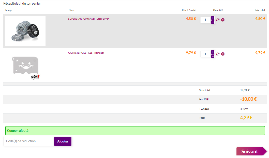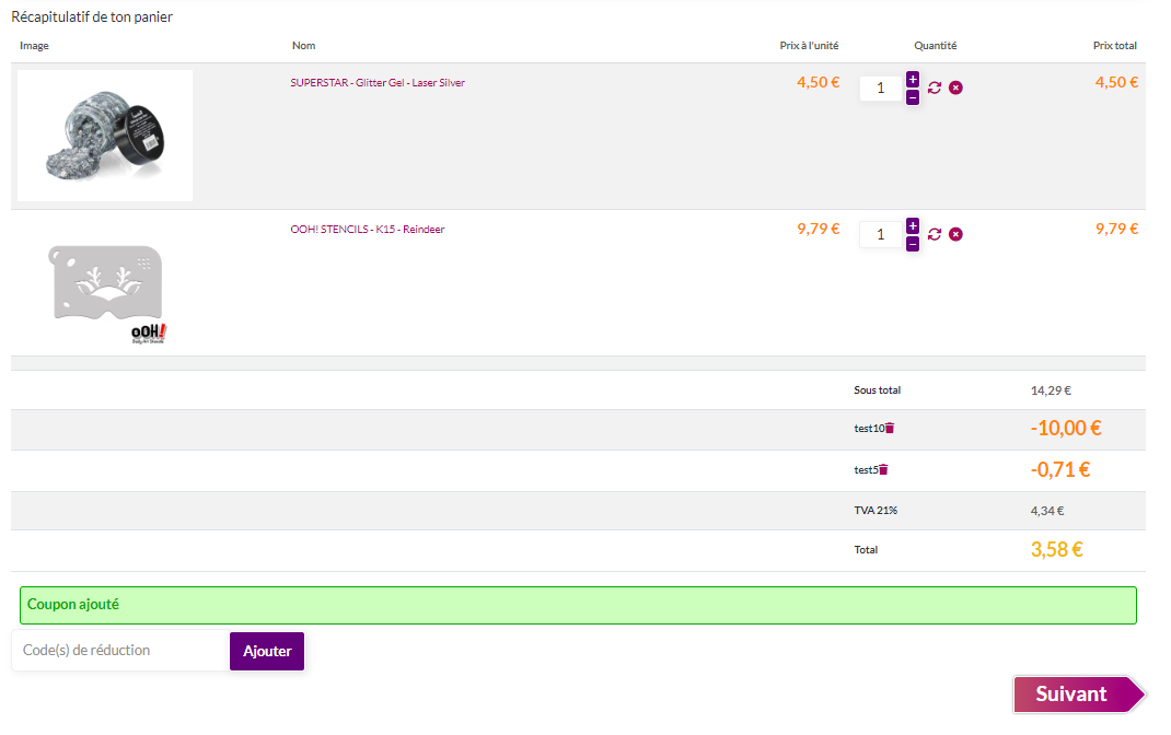 Dès que j'active le plugin multi coupon, le calcul de la TVA n'est plus correct. En exemple, le code test10 qui donne 10€ de réduction et le code test5 qui donne 5% de réduction. Si le plugin multi coupon est désactivé, la TVA liée à ces codes se calcule sans aucun souci.