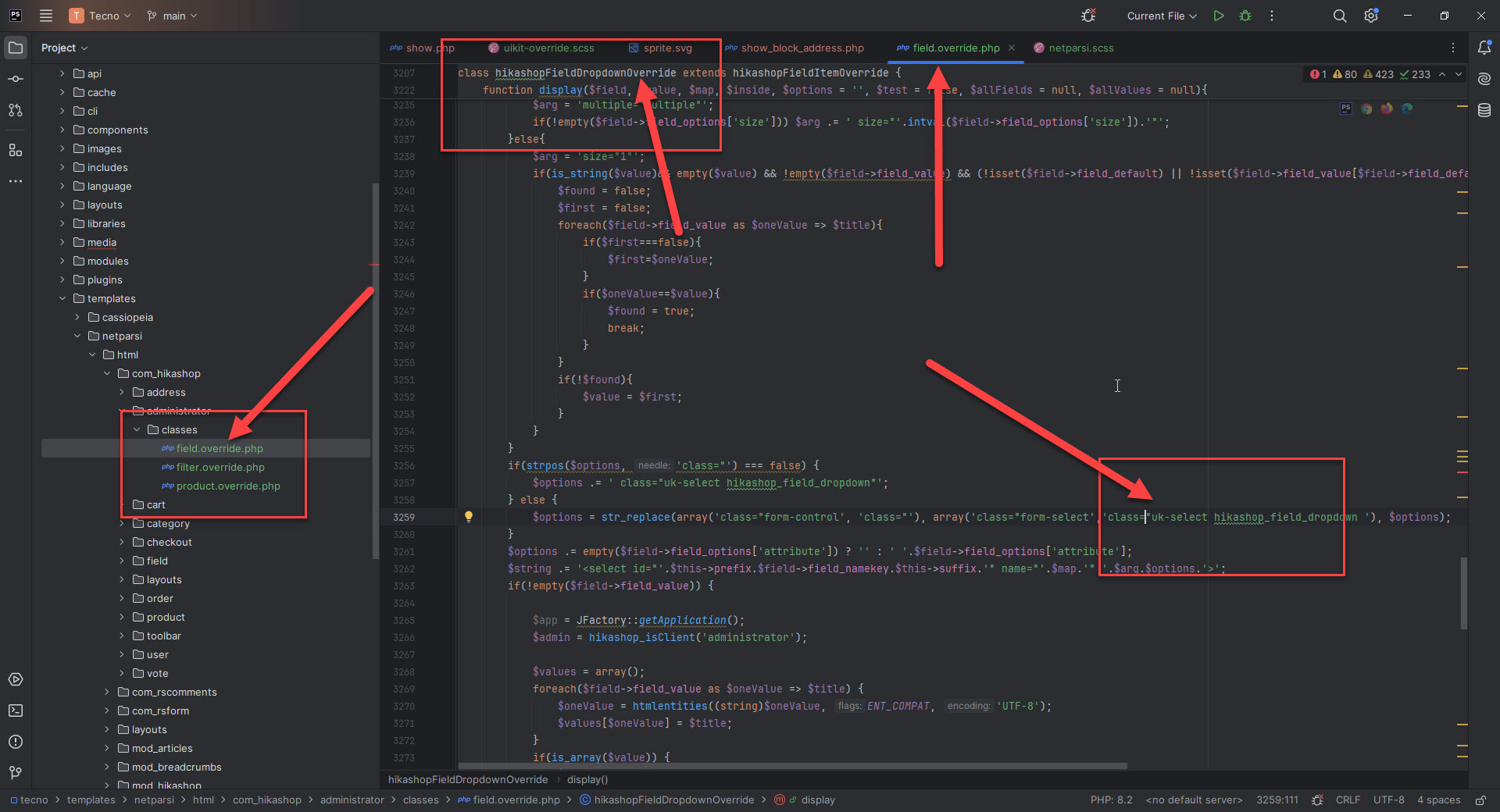 The field class file is special. It has the main class hikashopFieldClass which you can override normally. But it also have one class for each field type. It also has parent type classes like hikashopFieldDropdown and hikashopFieldItem which the type classes extend from.