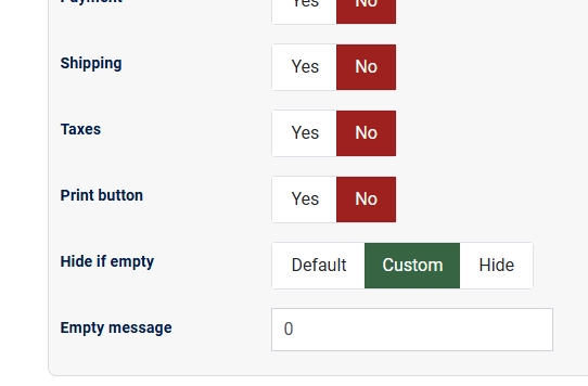 Both options do not work. The text field in the module 0 and 0 have the same effect also the language override CART_EMPTY="0" outputs nothing. Do you haven on other solution? Or maybe check string length to check if the fields is empty?