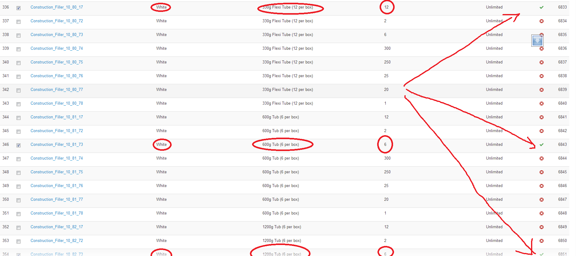 e,g, This pack size is only available in these variants (Pack size: 330g) (Colour: White) (12 units per box)