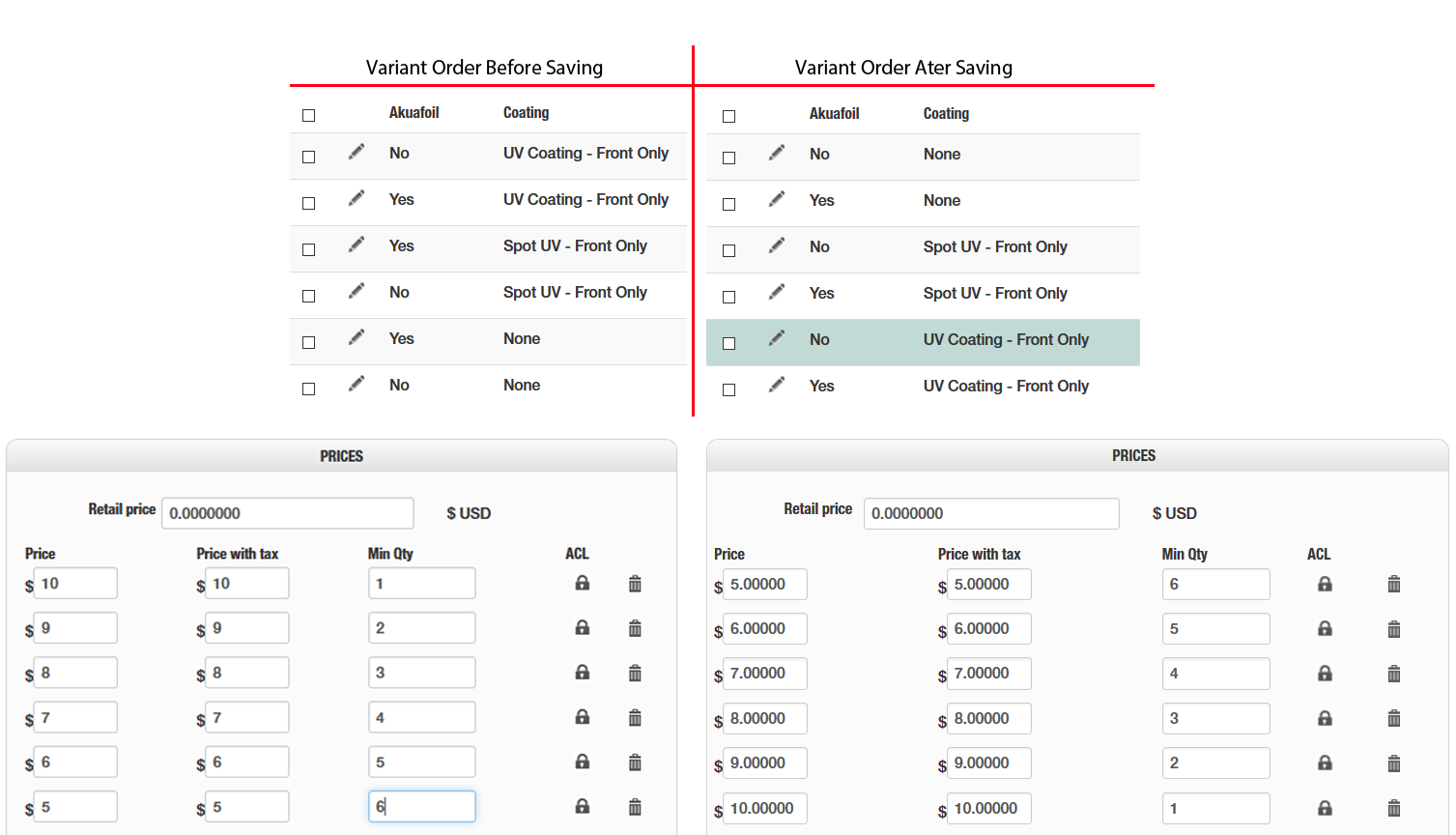The issue I'm seeing with prices changing order isn't as readily recreated, but there are times when the order of presentation makes no sense to me at all: not in the order entered, not ordered by quantity, not ordered by price as shown in the attached.