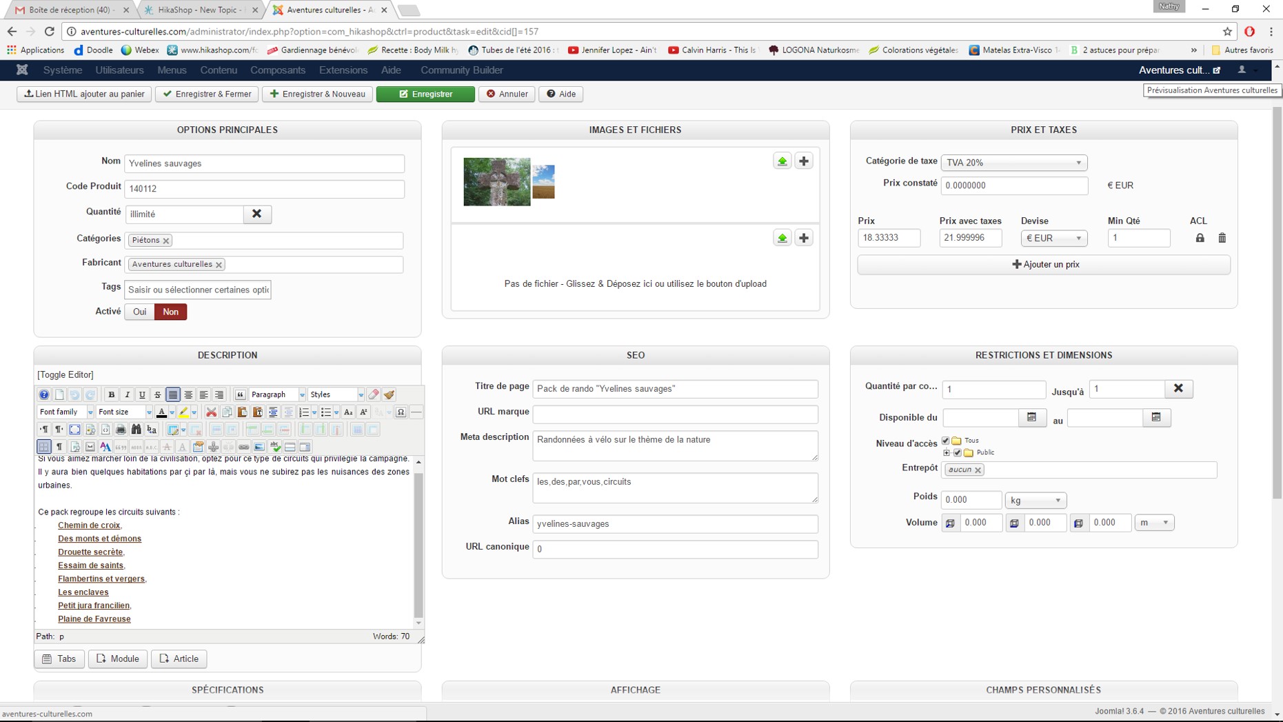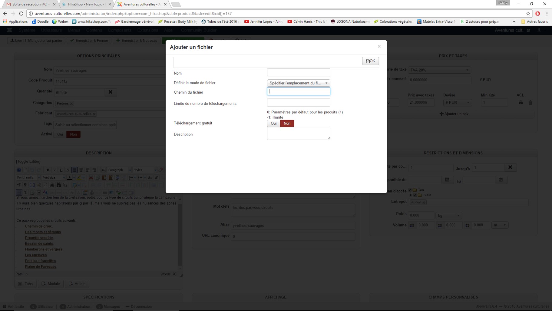 Dans ma boutique, je propose des produits touristiques (randonnées thématiques culturelles). J'ai donc créé des fiches produits et pour chaque produit, j'ai uploadé le fichier zip contenant toutes les informations utiles pour réaliser la randonnée.