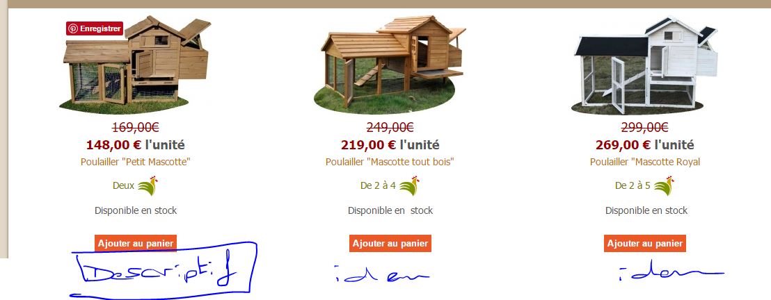 Mes clients aimerais avoir un bouton "descriptif" sous le bouton "ajouter". Je sais que je peux créer un bouton sous forme d'image et faire un lien vers le produit concerné mais s'il était possible d'ajouter un simple bout de code avec une image de bouton cela m'arrangerai beaucoup.