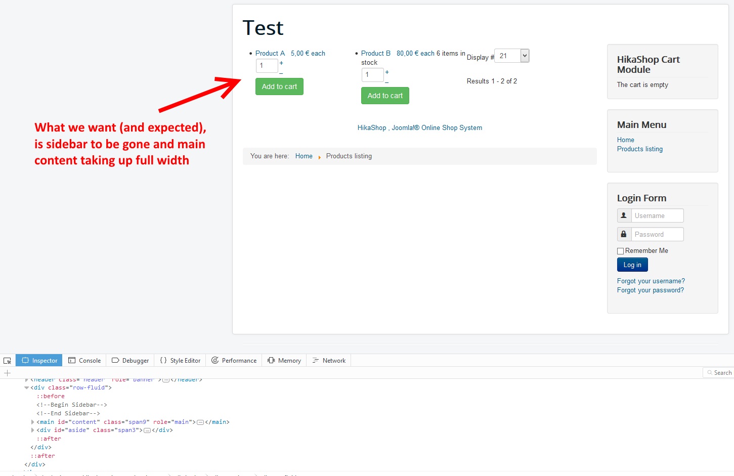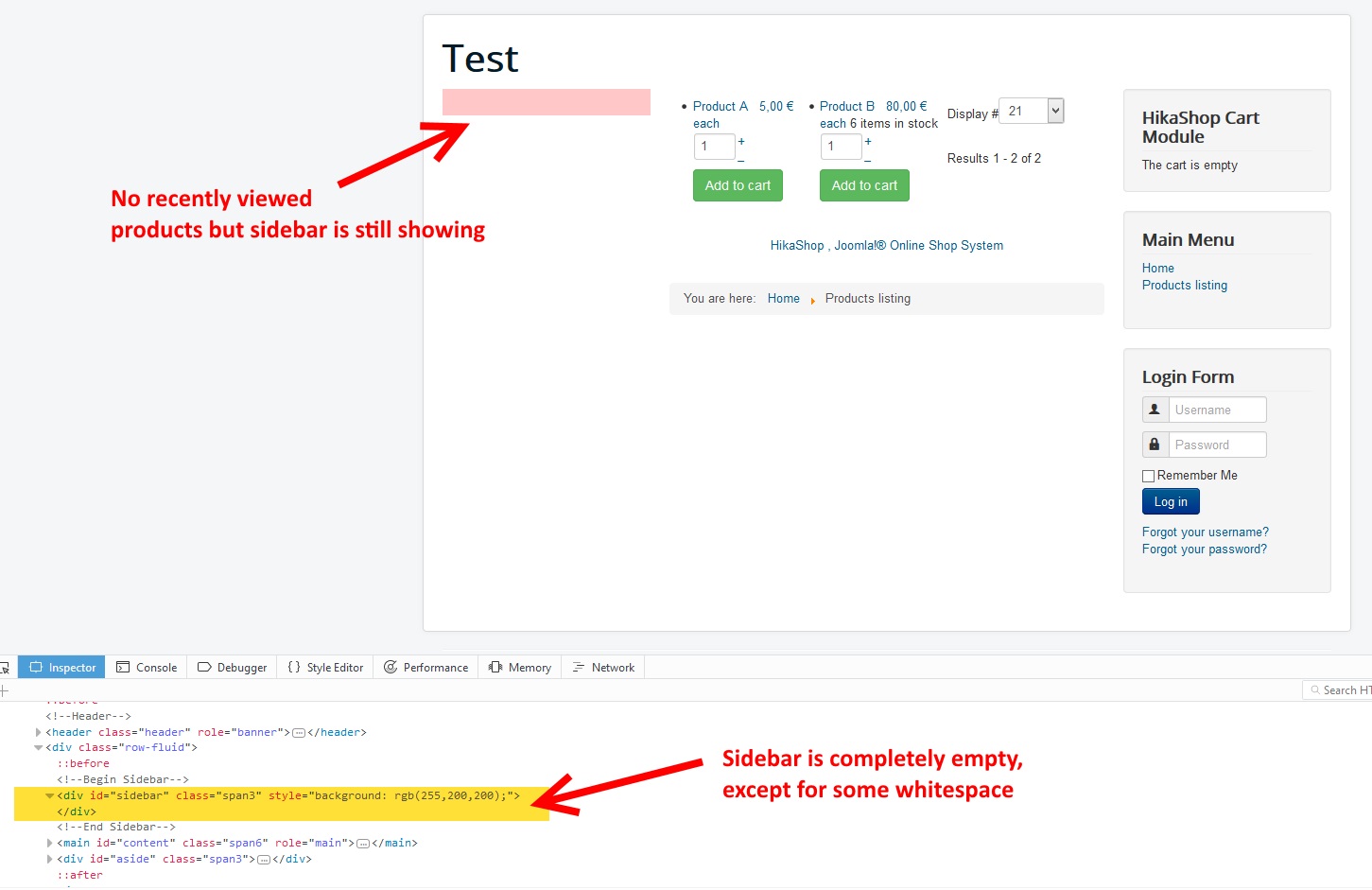 if($this->countModules('sidebar')):and this works fine for other modules, but not for the Hikashop Content Module. The countModules function will always return 1 with a Hikashop Content Module, even when it doesn't output anything (except some whitespace), as in our second screenshot.
