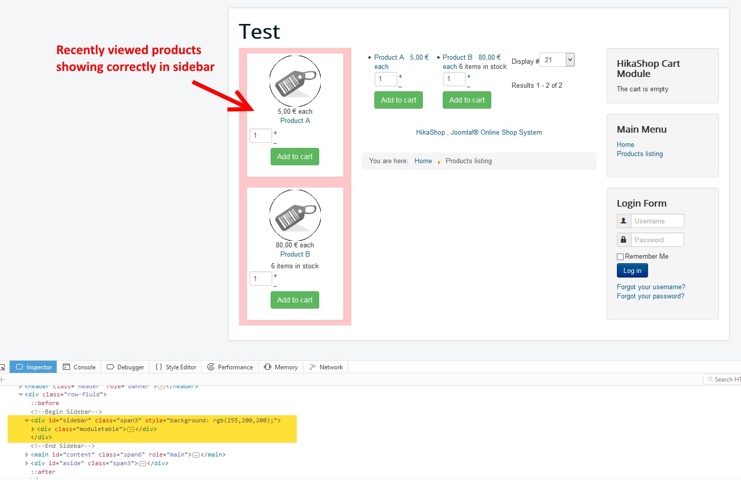 because it doesn't work the way we want to, we haven't got a live URL for you to take a look, but it is quite easy to reproduce, hopefully the attached screenshots will help show the issue. Using the default protostar template, in the first screenshot you can see the pink sidebar on the left showing some recent products we viewed before, this works ok (edit: after submitting we see the order of the attachments is mixed up, but the images end with 1, 2, and 3).