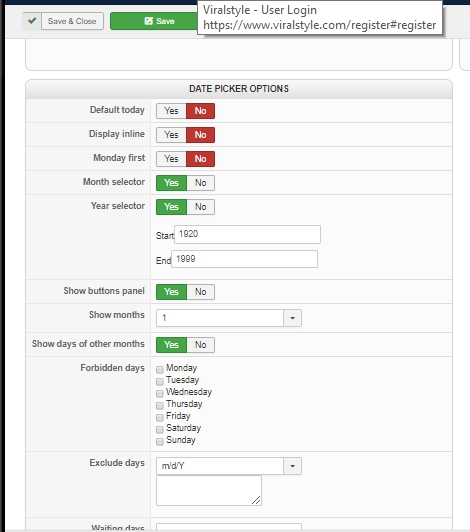 The screenshots should be in the order in which this was configured / tested. ie 1. Create New Field, 2. Configure, 3. Test in the configuration using example calendar, 4. Test HikaShop User Editor, 5, Test New User Registration (using the Joomla to Hikshop user registration plugin.