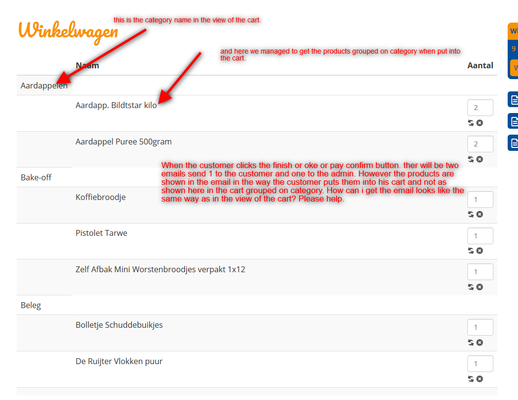 }So if you replace my comment by that code, you should have then the products properly sorted $data->cart->products and you can just leave the standard way of displaying the products after that, as I wrote my my previous message.