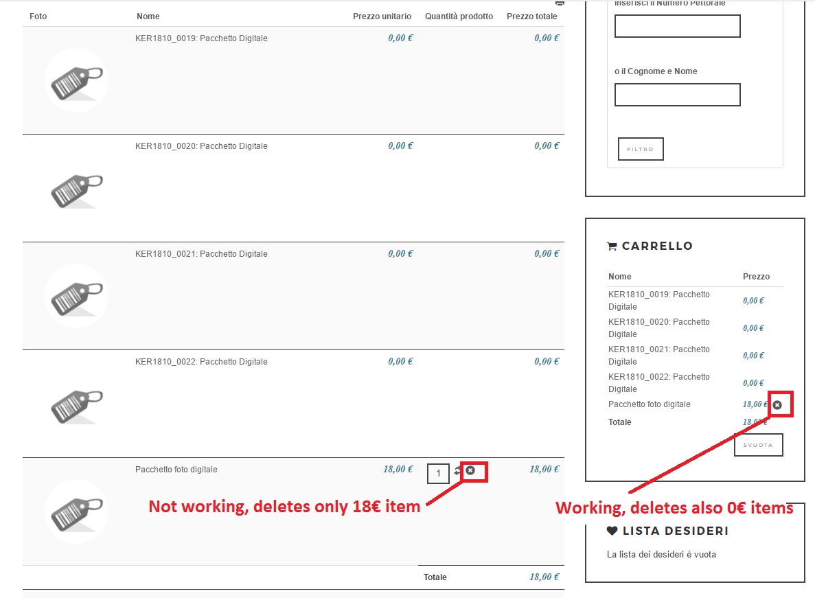 The result is a cart with an item with a price > than 0€ and the single photos (connected to the previous item) with 0€ value.