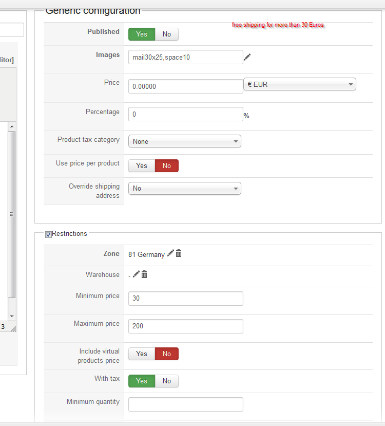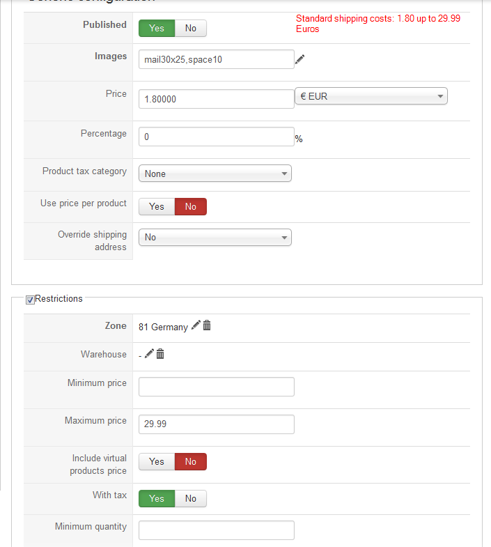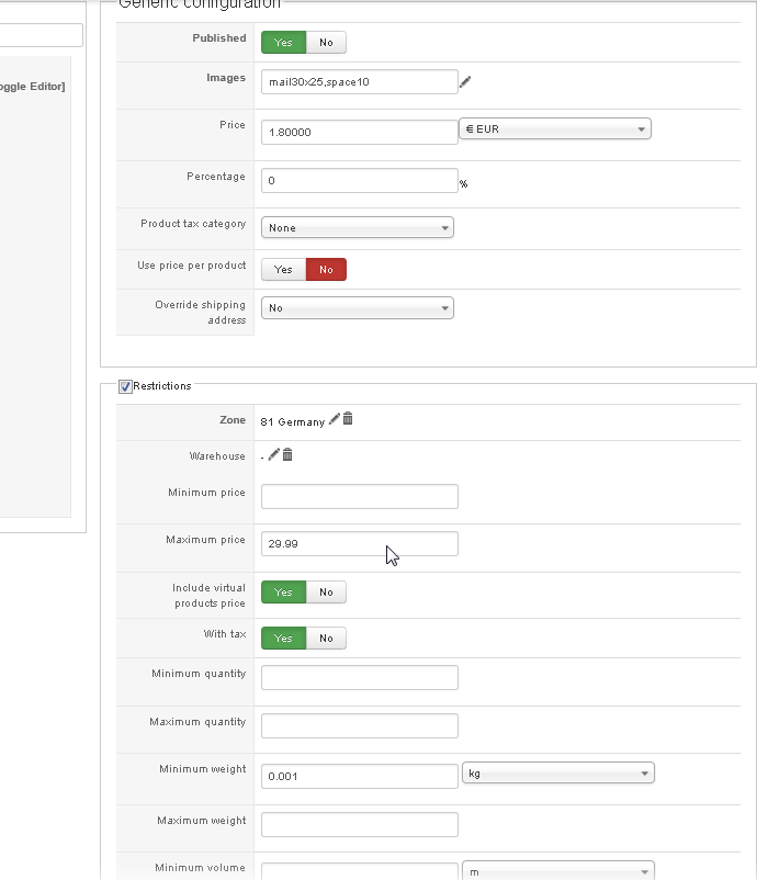 Include virtual products price : If you activate this option, the price of virtual goods (no weight) is taken into account for the maximum and minimum price restrictions above as well as the percentage price calculation. Otherwise, only the real goods (with a weight) are taken into account.