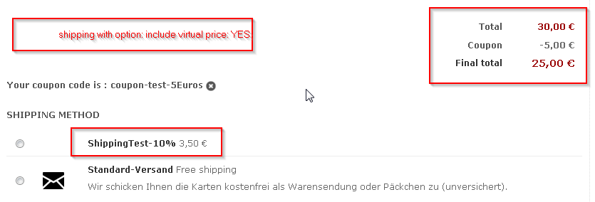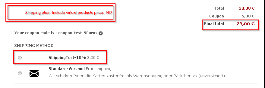 My limit for free standard shipping is 30 Euros. When I add a coupon for 5 Euros the free shipping is still offered, even the price is 25