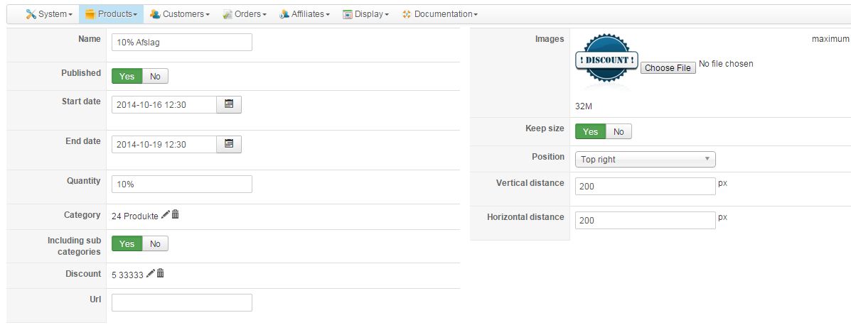 The badge item is linked to the main category and the discount item