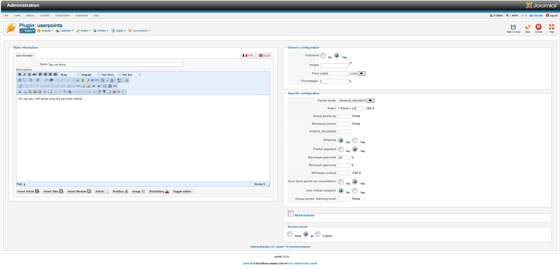 1. AWO Coupon is supposed to handle multiple coupons and supports HikaShop. I don't know if that will work fine with the points coupon, but I think it will (you can ask the AWO Coupon developer before trying if you want to make sure).