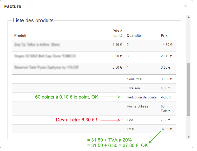 Quant à la TVA, elle a été calculée sur la base du montant HT qui ressort de la configuration (des produits, des frais de livraison, et des points), soit 31.50 €, d'où le total TTC : 31.50 X 20% = 6.30 €.