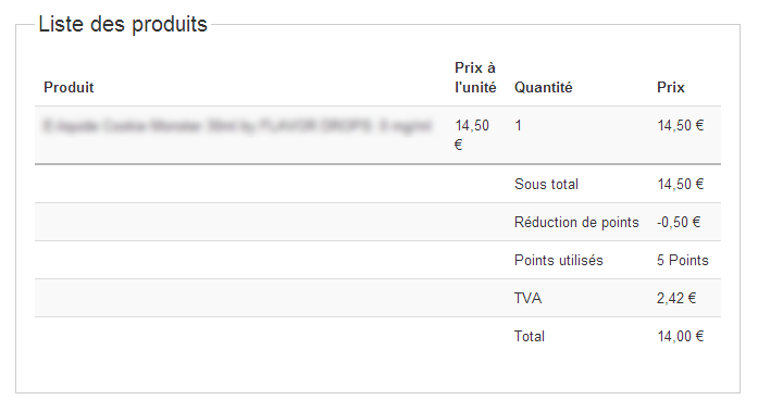 => Si la commande se faisait sans utilisation de points, le total à payer serait de : 12.08 € + TVA à 20 %, soit 12.08 € + 2.42 € = 14.50 € TTC.