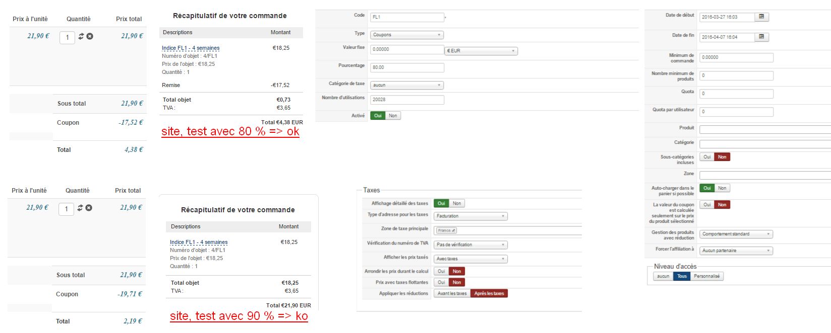 5eme cas : coupon de 90% (prix article 26.90). Le % est appliqué sur le prix HT. au lieu du TTC dans le panier, idem sur Paypal.=> plus possible à reproduire...