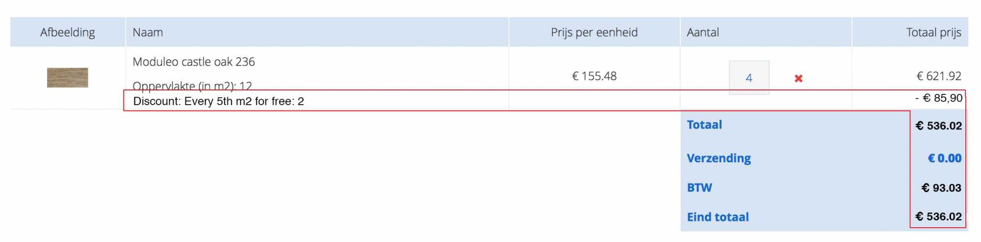 This is working fine but now he wants to advertise with the slogan "Every 5th m is for free". So, in the example above (when surface = 12, price per m2 = 42.95 and package price = 155.48 there should be a (calculated) discount of: ((floor)surface/5 * priceperm2))