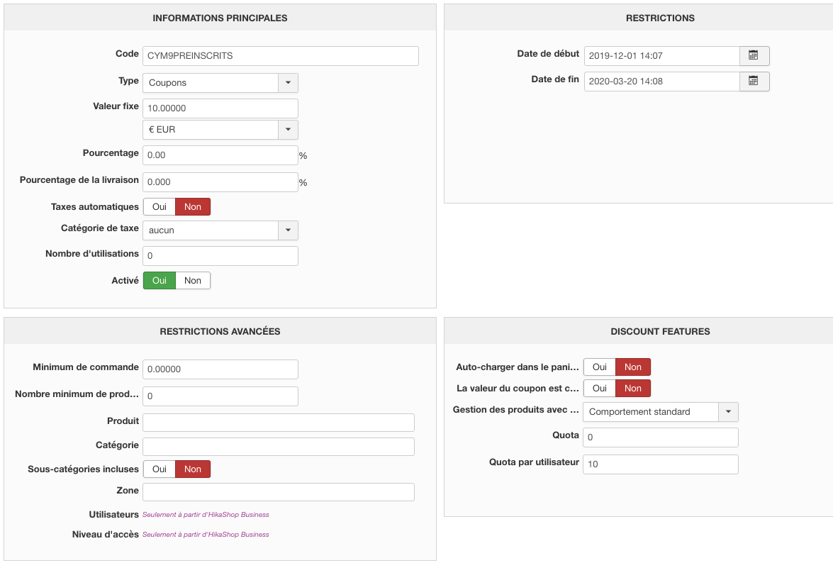L'explication que j'ai trouvé c'est que nous, en qualité d'administrateur, effectuons de nombreux tests. Si les rubriques des coupons "nombre d'utilisation" et "quota par utilisateur" ne sont pas vierge, les commandes en test ou non validées bloquent l'usage du code.