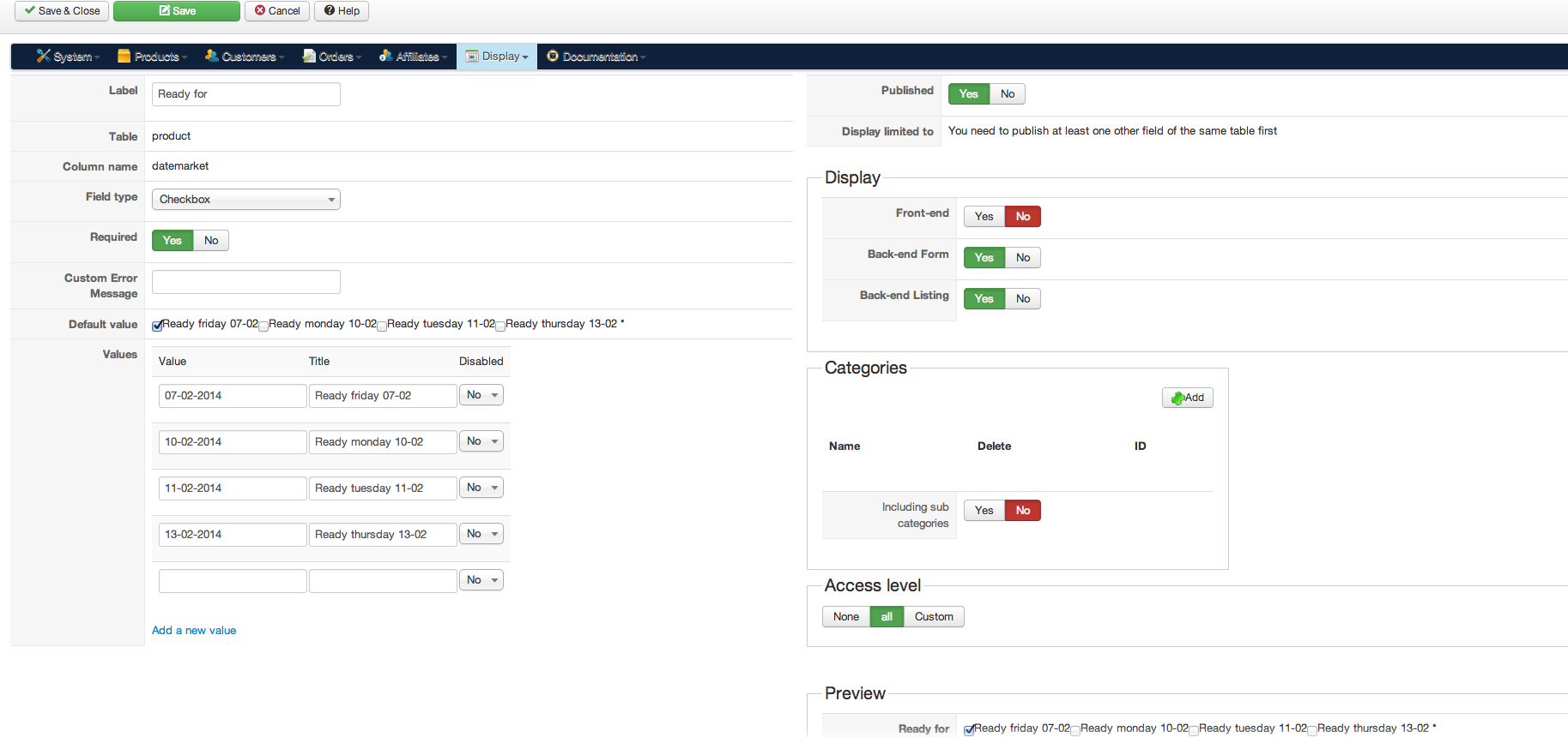 Then I created a sample list of products and for each product I selected the days customers can buy them (image attached).